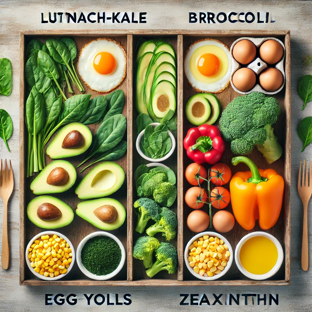 - 루테인: 시금치, 케일, 브로콜리, 아보카도, 옥수수