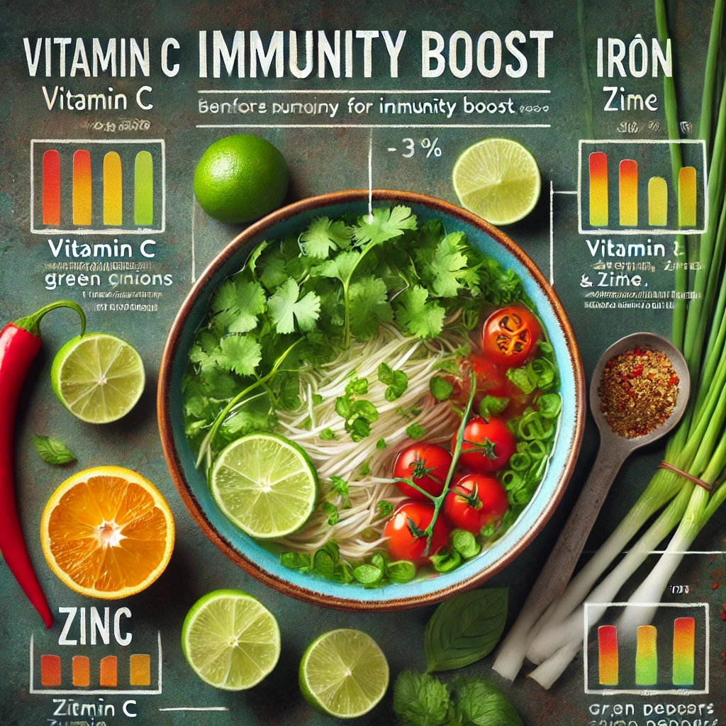 쌀국수 한 그릇에는 비타민 A, 비타민 C, 아연, 철분 등의 미네랄이 풍부하게 포함되어 있습니다. 특히 숙주나물, 고수, 라임 같은 재료들은 항산화 효과가 있어 면역력을 높이는 데 도움을 줍니다.
