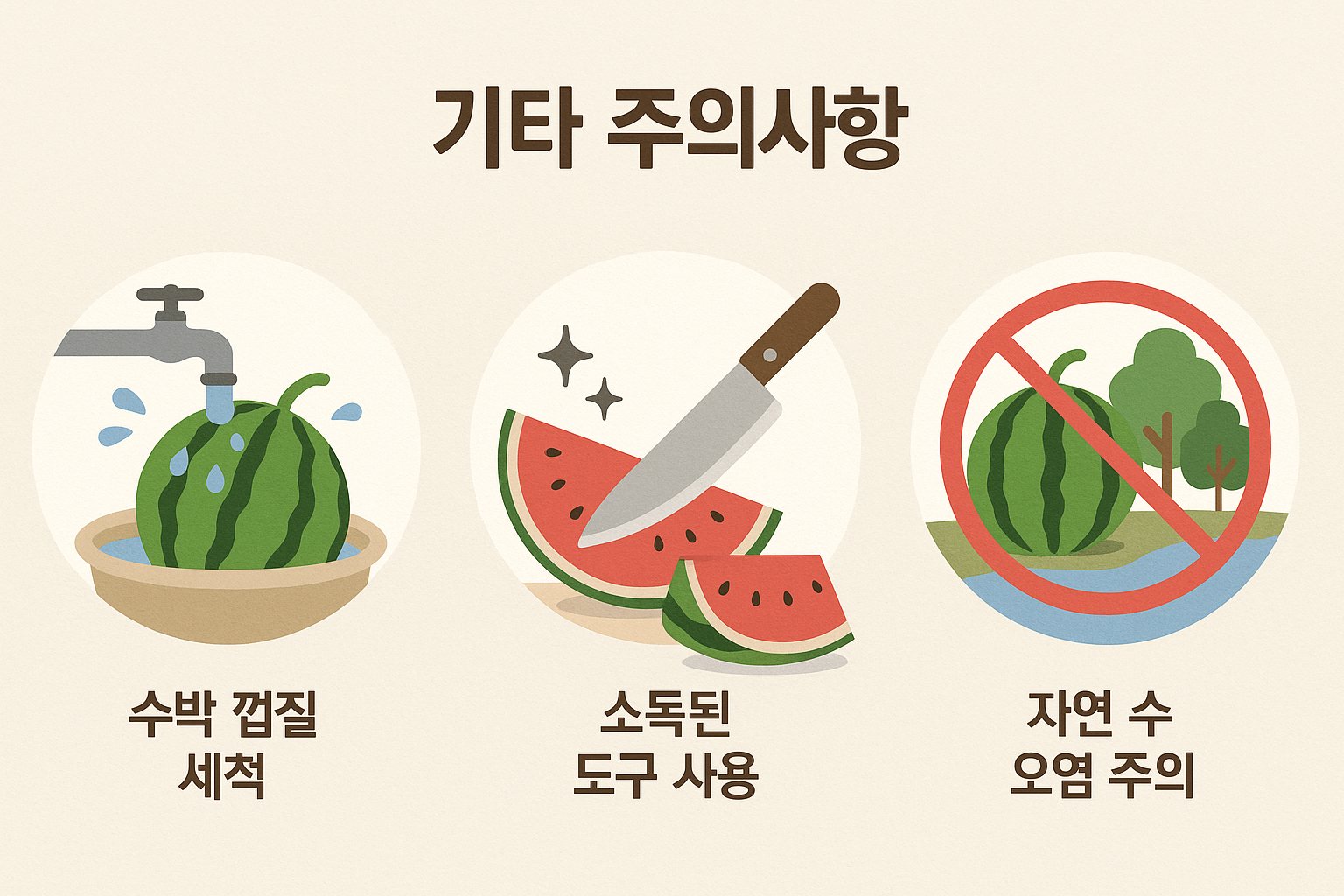 - 수박을 자르기 전, 껍질을 깨끗이 세척하고 멸균 칼·도마 사용