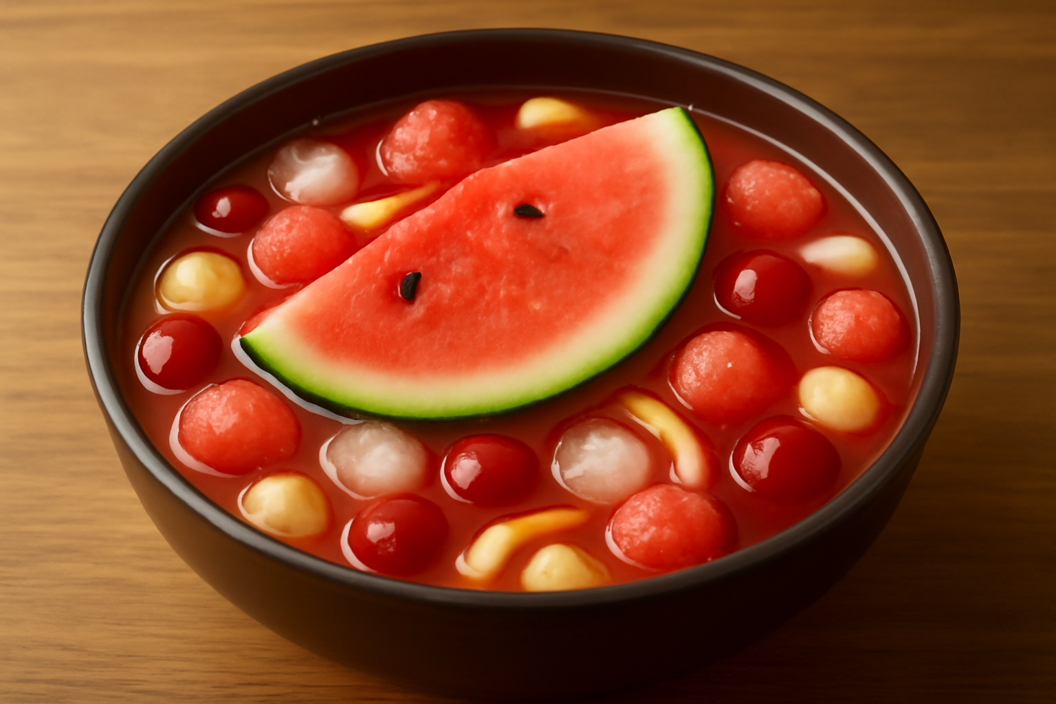 수분과 비타민이 풍부한 수박과 다양한 과일을 넣은 디저트로, 탈수 예방 및 갈증 해소에 좋습니다.