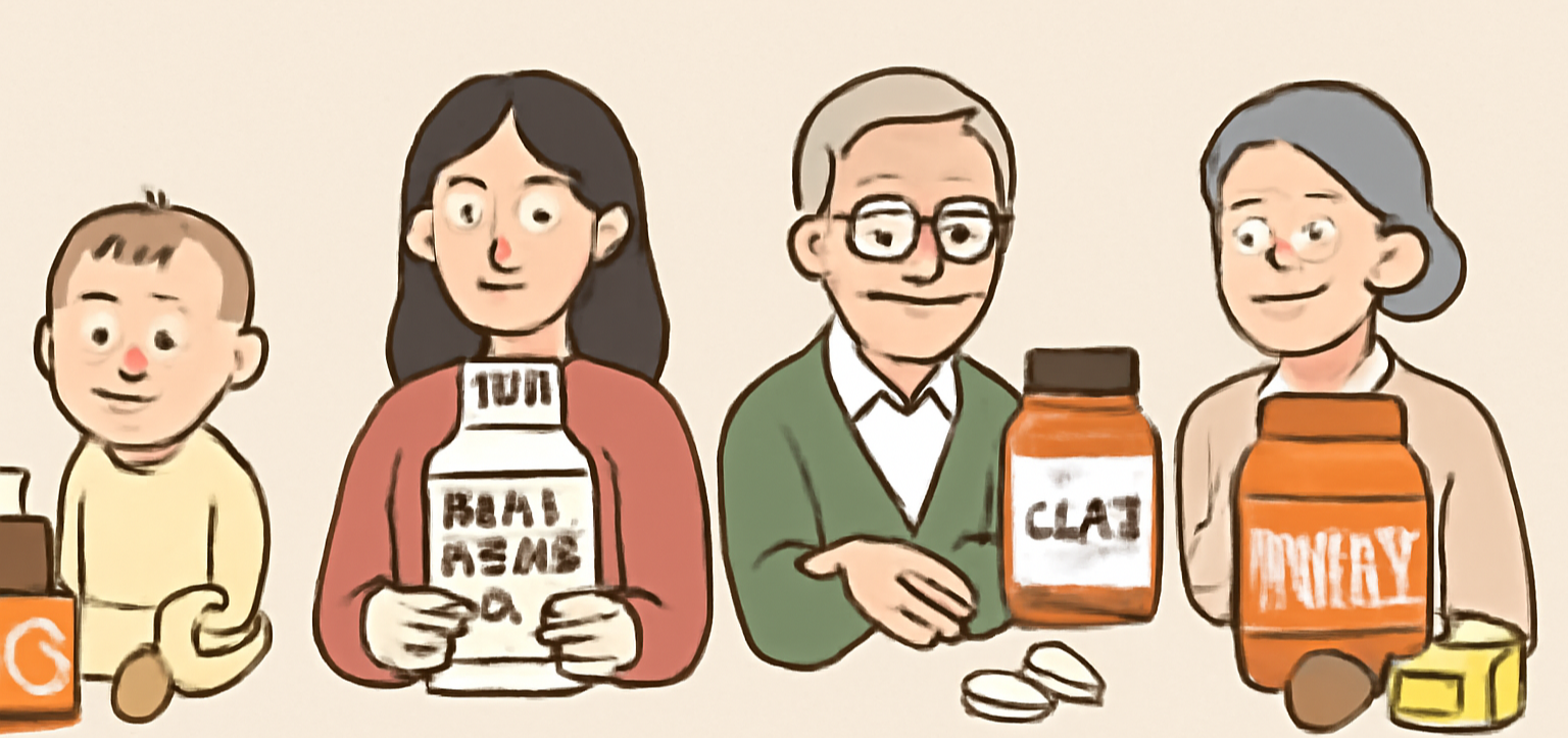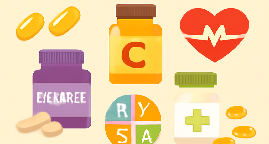 - 어린이: 멀티비타민 구미, 오메가3 츄어블, 키즈용 프로바이오틱스