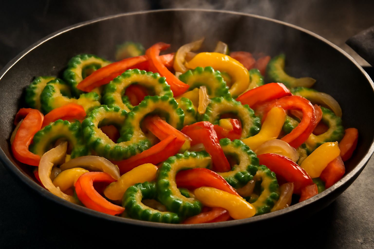 - 속을 제거한 여주를 어슷썰어 양파, 파프리카 등 채소와 함께 볶습니다.