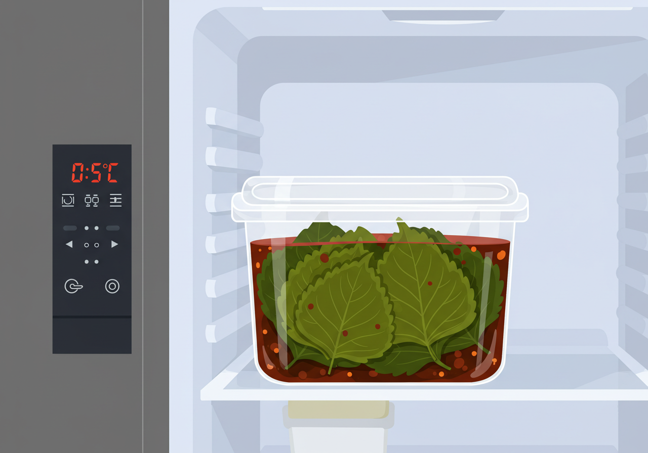 깻잎장아찌는 0~5도 사이의 냉장 보관이 이상적입니다. 밀폐 용기에 보관해 산소 접촉을 최소화하고, 간장 국물이 깻잎을 완전히 덮도록 해야 합니다. 이렇게 하면 변질 속도를 늦추고 신선함을 오래 유지할 수 있습니다.